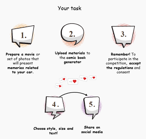 The competition was simple and consisted of five steps. After logging in to the platform, users added movies or photos from which AI chose the best frames. Then, the User chose the number of comic frames, the comic style and, if he felt like it, added clouds with texts. The works were aggregated on a platform on which the participants of the competition could submit further comics or vote for those which they considered best.